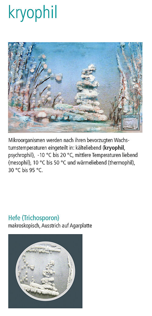 Als ich die Arbeitswelt des Speziallabors für angewandte Mikrobiologie in Adlershof kennen lernen durfte, inspirierte mich die ganz eigene Lebensweise der Bakterien und Pilze. Die wundersamen Formen regten meine Fantasie an, wie die Wolken am Himmel. Sicher war es auch für die Mitarbeiter*innen spannend, wie ich auf humorvolle Weise ihre Untersuchungsobjekte in einen neuen Kontext brachte. Dafür malte ich mit verschiedenen experimentellen Techniken auf Fotos, die ich vorher digital verwandelte. Uns war wichtig, in einem kleinen Feld das Ursprungsfoto und die Bezeichnung des Dargestellten als Gegenüberstellung darzustellen. Im Ergebnis entstand diese Serie von Laborfantasien.